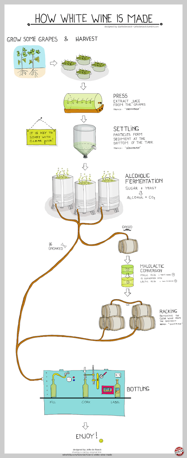 화이트 와인을 발효시키는 데는 약 14 일이 걸립니다. 섬세한 꽃 향기를 보존하기 위해 화이트 와인은 레드 와인보다 낮은 온도에서 발효됩니다. 화이트 와인은 개방형 발효 탱크에 거의 넣지 않습니다. 와인 메이커가 단맛의 수준을 제어한다는 것이죠. 와인 메이커가 약간 달콤하거나 드라이하지 않은 와인을 원하면 효모가 설탕을 먹어치우는 것을 조절합니다 (일반적으로 낮은 온도에서 냉각).