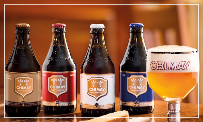 블루(Chimay Bleue): 9%의 알코올 도수를 가지고 있으며 벨지안 다크스트롱 쿼드루펠로 짙은 갈색을 띠며, 매우 풍부한 바디감과 과일, 견과류, 커피의 풍미를 가지고 있습니다.